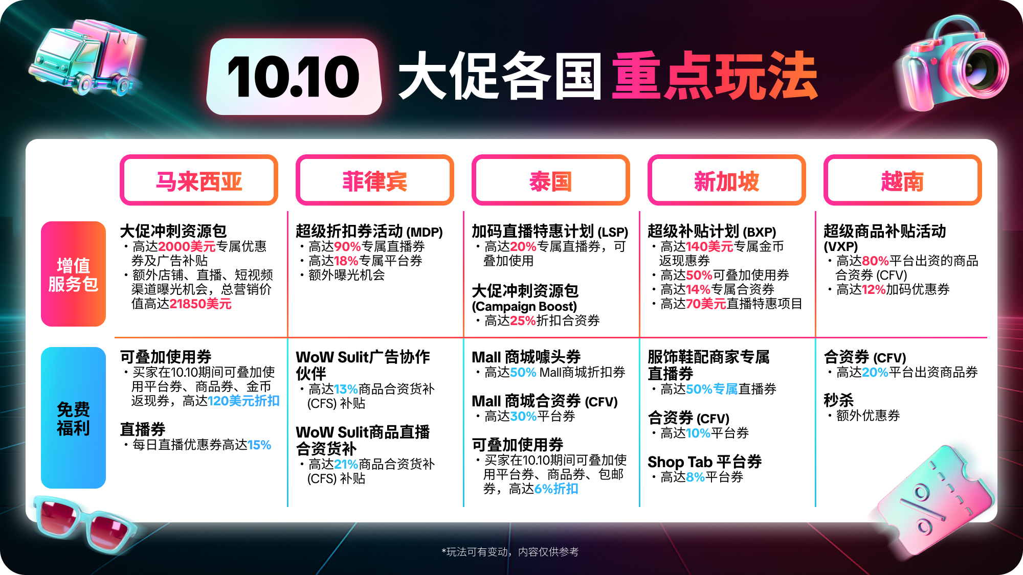 为您呈现本次10.10大促的核心玩法矩阵:我们精心打造了涵盖 “人、货、场” 的权益体系,包括高达2000美元的专属优惠券、高达90%专属直播券、以及高达50%可叠加使用券。我们全面赋能各类购物场景,助力商家放大转化。别再犹豫,立即扫描下方二维码,获取东南亚五国增值服务包与免费福利详情!